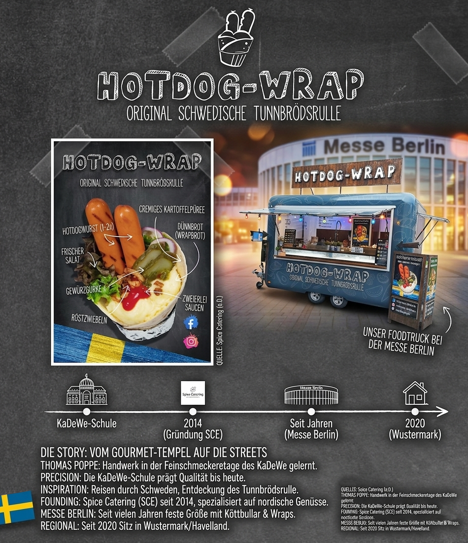Seit der Gründung seines Caterings im Jahr 2014 hat sich Poppe einen Namen als Spezialist für nordische Genüsse gemacht. Die Inspiration dazu holte er sich direkt an der Quelle: Bei Reisen durch Schweden verliebte er sich in die Tunnbrödsrulle – den klassischen Hotdog-Wrap (Spice Catering, o.D.). Seit vielen Jahren ist er mit diesem Konzept eine feste Größe auf dem Gelände der Messe Berlin, wo er hungrige Fachbesucher mit einer Mischung aus Köttbullar, Smörgåstårta (Sandwichtorte) und seinen berühmten Wraps versorgt (Tagesspiegel, 2017).